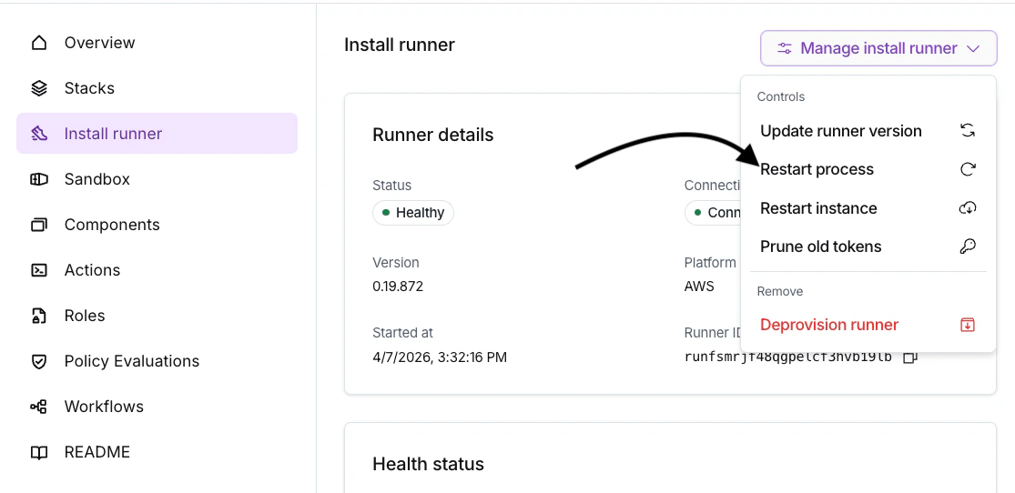 To resume normal operation, edit the ASG and set the capacity back to 1/1/1 (Desired: 1, Min: 1, Max: 1). The Runner will restart if you navigate to the Install’s Runner and choose Restart process on the Runner.