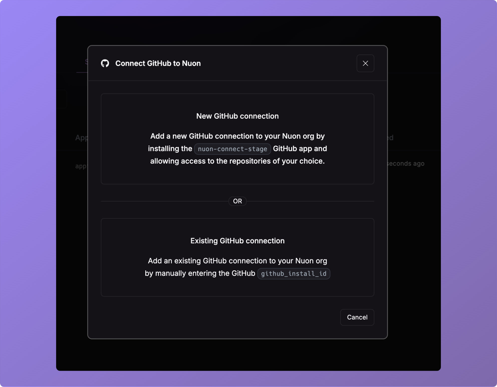You can now import a VCS connection into your org. This is useful for sharing the same Github installation of between different Nuon orgs.